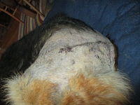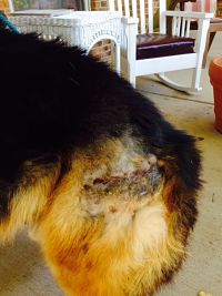 Freddie had huge sores on both hips. They had been left untreated for so long that much of the skin had necrotized. After surgery Freddie's hip sores started to heal nicely.